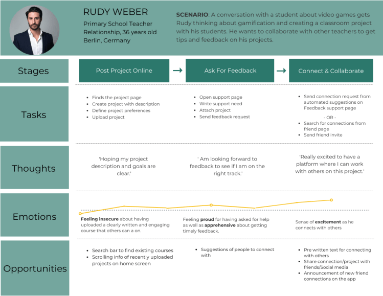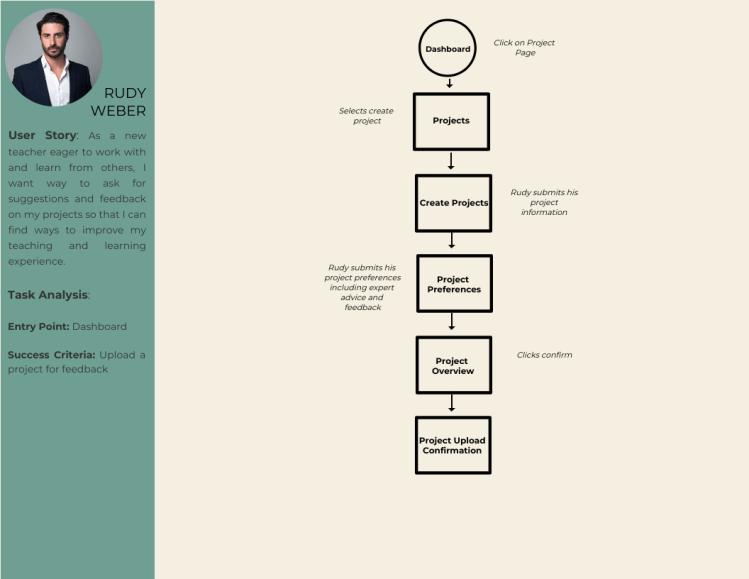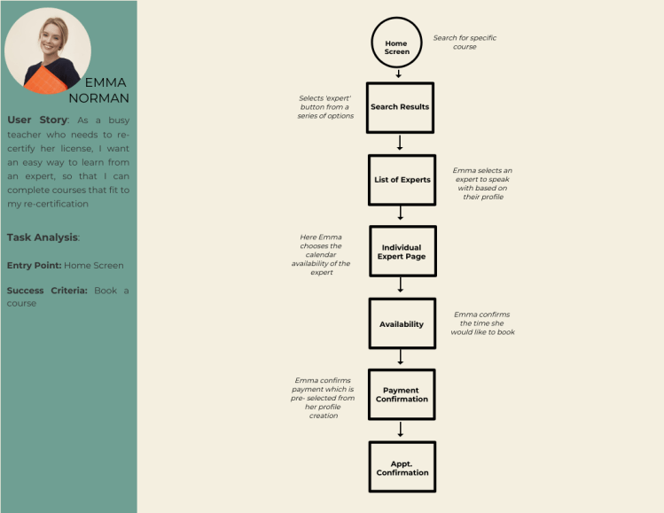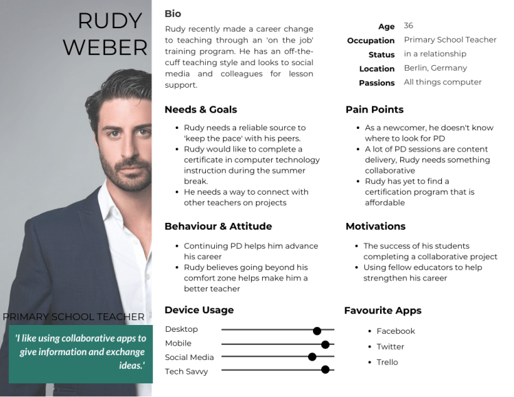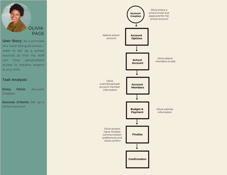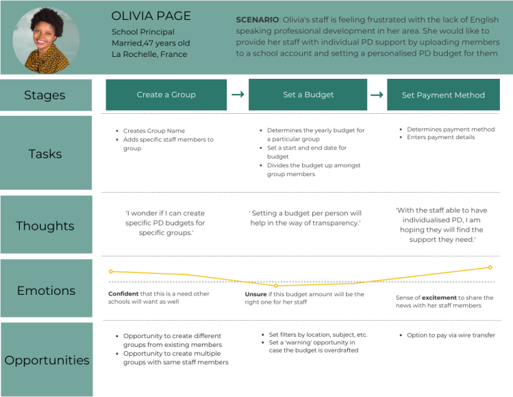 Based on the research three user personas were created. Emma is a teacher looking to re-new her license and wants to take a course online with an expert. Rudy an enthusiastic and passionate teacher looking to collaborate with other teachers on his project. Finally, Olivia is is a school principal looking to set up an account to ensure her staff has access to personalised professional development.