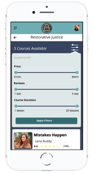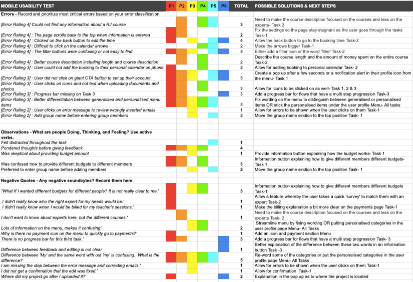In person and usability tests were conducted with 6 people both in person and online. After a few background questions, users were asked to complete several tasks on the Eduteach prototype. By observing users facial expressions and body language and analysing the recorded results, I gathered all this information into a rainbow sheet where I could interpret the results and brainstorm the next steps of refining the app