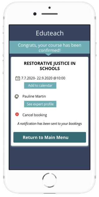 Eduteach is about providing professional development services to educators on the go or for educators who cannot find courses and experts in their local community. The app conveys a level of professionalism but also feelings of familiarity. This was especially important to me when creating my style guide. My goal with Eduteach was to choose the primary color blue, thus evoking a sense of reliability, trustworthiness and communication. Choosing green as a secondary color, indicating growth and vitality. Branding was kept to a minimum with the logo being displayed only in the header. The tone of the app is professional yet familiar and tried to create a comfortable feel for users when booking and speaking with experts.